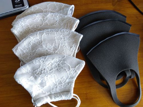 マスクは白い方は手作りしたもので、生地が厚すぎて息苦しかった。黒い方は唇がかゆくなってしまったので破棄。