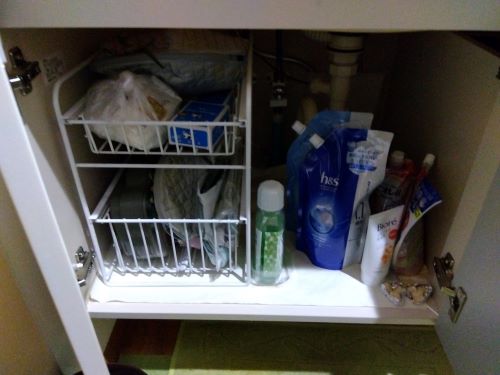 洗面台の下収納には今まで通りシャンプーなどのストックと元々入っていたものをそのまま入れた。